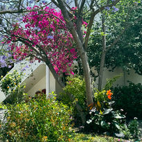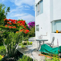 2- Un departamento privado en planta baja con dos habitaciones, totalmente equipado, con una terraza al frente con vista a un gran jardín lleno de colores y en la parte trasera un jardín privado con plantas y flores.